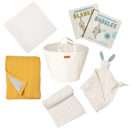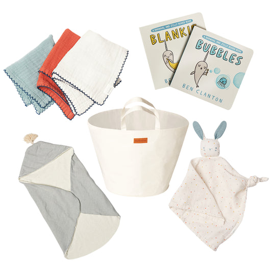 Personalize our gift bundles by picking the perfect colors and sizes. All bundles include a book and the cutest lovey named Babs! Gift bundles that include Babette's washable kraft paper storage bin, will arrive packaged inside the bin. Babette's storage bin is a versatile and functional storage solution to keep a nursery tidy, and can transition to any room in your house. (15" D x 11" H.) Make sure to Include a gift note at check out which will be printed on a gift card and included in the bundle. Gifting has never been so easy!